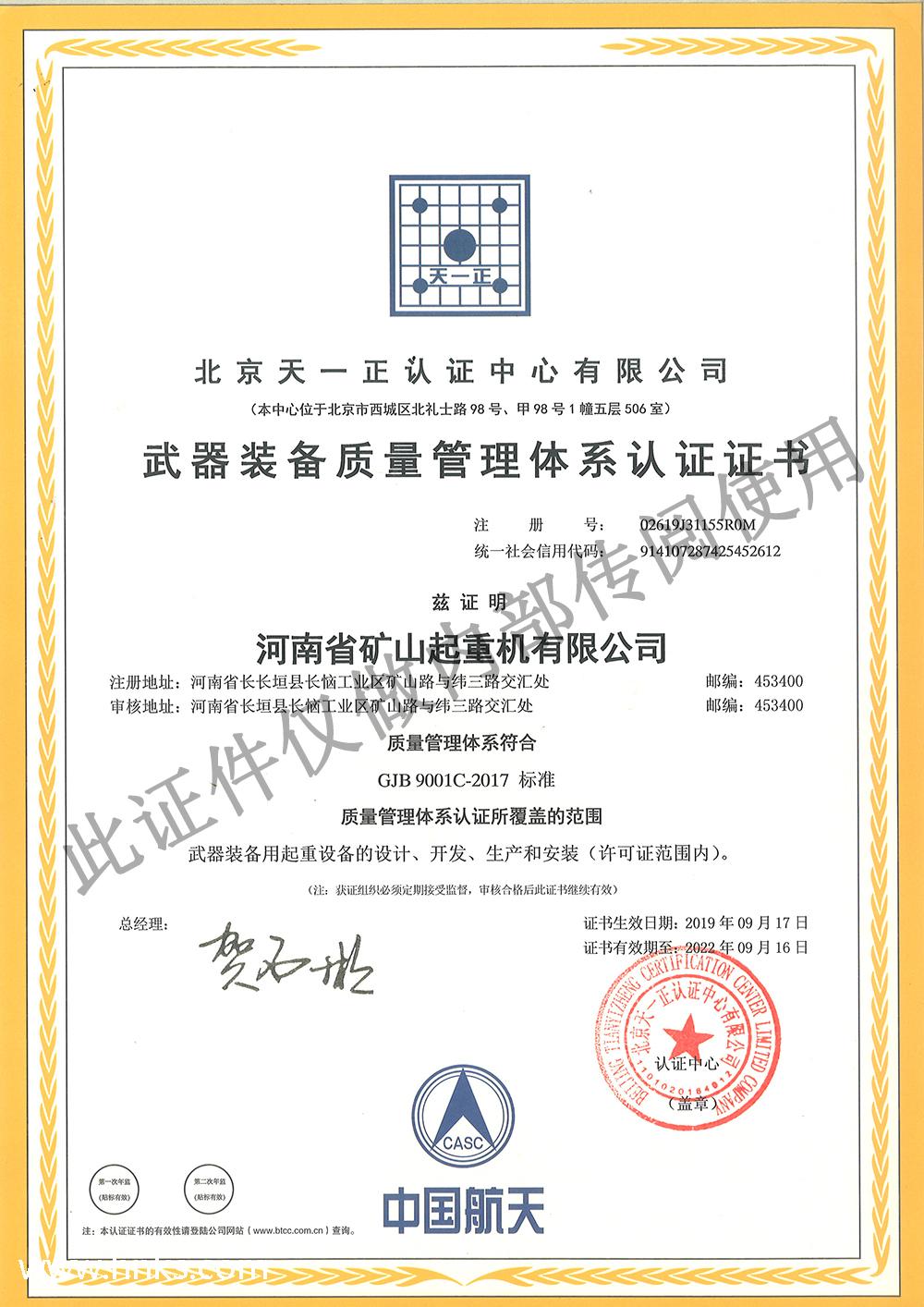 9月22日,河南礦山獲得北京天一正認證中心有限公司頒發的《GJB9001C-2017武器裝備質量管理體系認證證書》,是行業內通過C版國軍標質量管理體系認證的少數幾家單位之一。