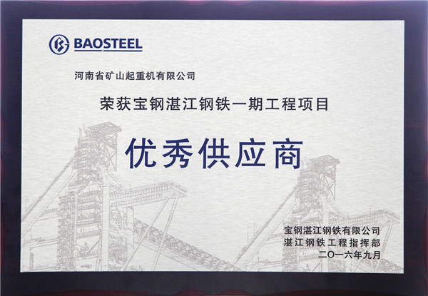 我公司為寶鋼湛江項目承制的起重機在使用過程中,憑借過硬的產品質量榮獲寶鋼湛江鋼鐵一期工程項目“優秀供應商”榮譽稱號。