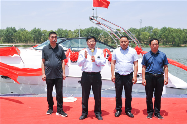 ▲長(zhǎng)垣市水利局副局長(zhǎng)付華鵬宣布“礦山1號(hào)”游艇下水啟航