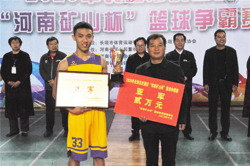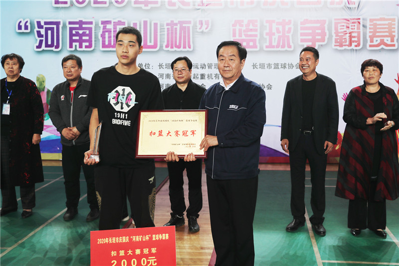 ▲河南礦山總裁岳相斌為獲得扣籃大賽冠軍的劉宇頒獎