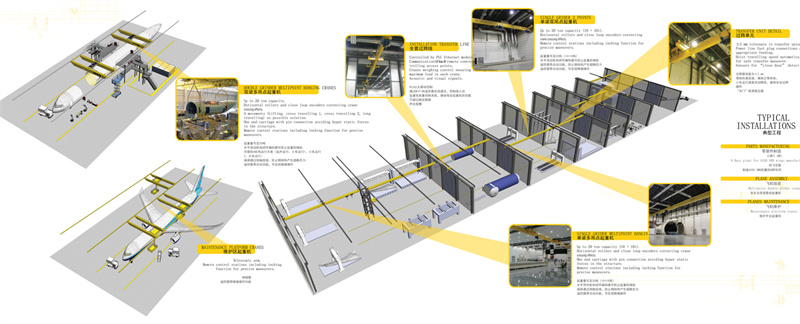 航空工業的生產設備需要能夠覆蓋整片區域的空中物流搬運系統。懸掛起重機聯鎖操作,實現車間內敏感部件的過跨搬運,以及裝配區域各個工位的連接。這就節省了寶貴的時間并