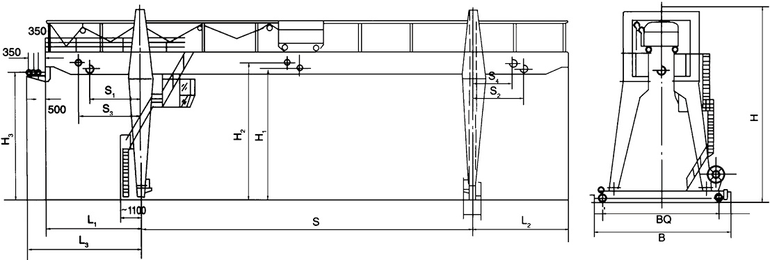 A型雙主梁吊鉤門式起重機適用于露天貨場、鐵路沿線作業進行一般的裝卸及起重搬運工作。A型門架結構,上面帶有馬鞍結構,受力合理,為國內使用最廣泛的雙主梁門式起重機。根據其結構形式,可分為包廂式MG,額定起重量5~320t;以及減